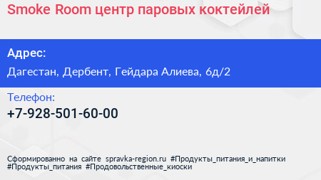Smoke Room, центр паровых коктейлей по адресу Дагестан, Дербент, Гейдара Алиева, 6д/2 в дальнейшем Организация, размещена в следующих категориях: