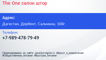 The One, салон штор по адресу Дагестан, Дербент, Сальмана, 100г в дальнейшем Организация, размещена в следующих категориях: