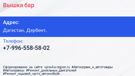 Вышка, бар по адресу Дагестан, Дербент, в дальнейшем Организация, размещена в следующих категориях:
