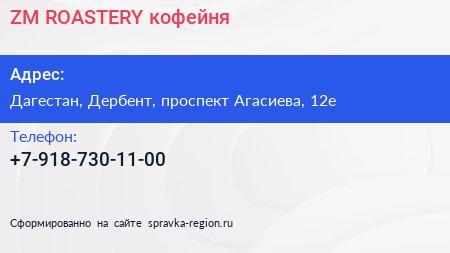ZM ROASTERY, кофейня по адресу Дагестан, Дербент, проспект Агасиева, 12е в дальнейшем Организация, размещена в следующих категориях: