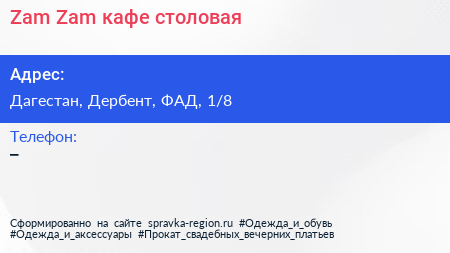 Zam-Zam, кафе-столовая по адресу Дагестан, Дербент, ФАД, 1/8 в дальнейшем Организация, размещена в следующих категориях: