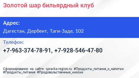 Золотой шар, бильярдный клуб по адресу Дагестан, Дербент, Таги-Заде, 102 в дальнейшем Организация, размещена в следующих категориях: