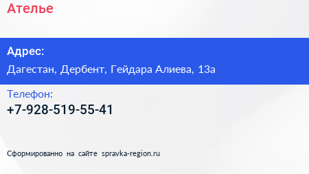 Ателье по адресу Дагестан, Дербент, Гейдара Алиева, 13а в дальнейшем Организация, размещена в следующих категориях:
