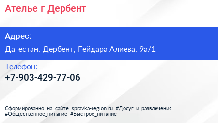 Ателье, г. Дербент по адресу Дагестан, Дербент, Гейдара Алиева, 9а/1 в дальнейшем Организация, размещена в следующих категориях: