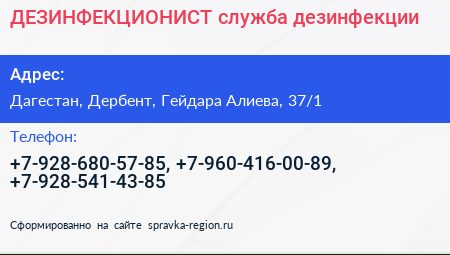 ДЕЗИНФЕКЦИОНИСТ, служба дезинфекции по адресу Дагестан, Дербент, Гейдара Алиева, 37/1 в дальнейшем Организация, размещена в следующих категориях: