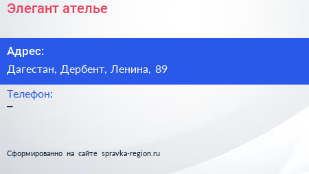 Элегант, ателье по адресу Дагестан, Дербент, Ленина, 89 в дальнейшем Организация, размещена в следующих категориях:
