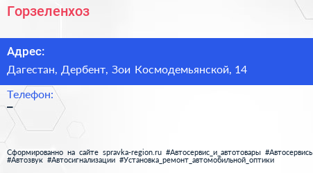 Горзеленхоз по адресу Дагестан, Дербент, Зои Космодемьянской, 14 в дальнейшем Организация, размещена в следующих категориях: