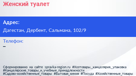 Женский туалет по адресу Дагестан, Дербент, Сальмана, 102/9 в дальнейшем Организация, размещена в следующих категориях: