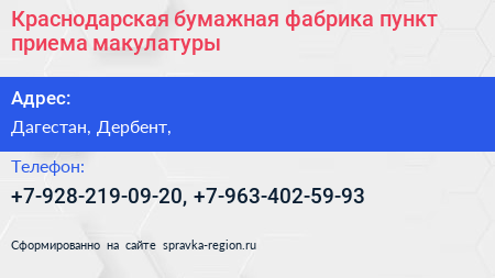 Краснодарская бумажная фабрика, пункт приема макулатуры по адресу Дагестан, Дербент, в дальнейшем Организация, размещена в следующих категориях: