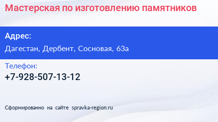Мастерская по изготовлению памятников по адресу Дагестан, Дербент, Сосновая, 63а в дальнейшем Организация, размещена в следующих категориях: