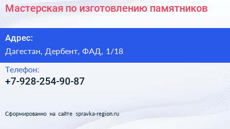 Мастерская по изготовлению памятников по адресу Дагестан, Дербент, ФАД, 1/18 в дальнейшем Организация, размещена в следующих категориях: