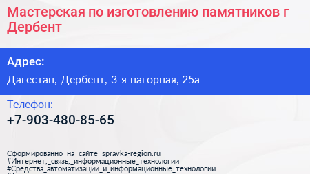 Мастерская по изготовлению памятников, г. Дербент по адресу Дагестан, Дербент, 3-я нагорная, 25а в дальнейшем Организация, размещена в следующих категориях: