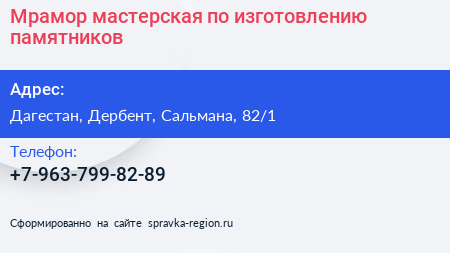 Мрамор, мастерская по изготовлению памятников по адресу Дагестан, Дербент, Сальмана, 82/1 в дальнейшем Организация, размещена в следующих категориях: