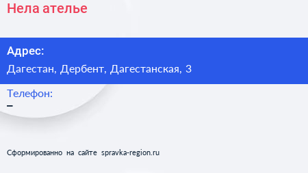 Нела, ателье по адресу Дагестан, Дербент, Дагестанская, 3 в дальнейшем Организация, размещена в следующих категориях: