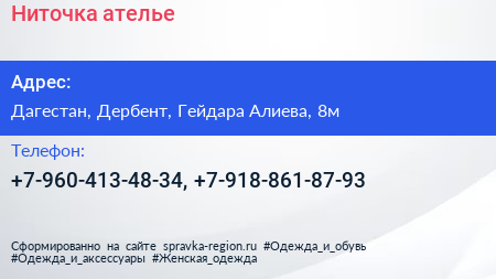 Ниточка, ателье по адресу Дагестан, Дербент, Гейдара Алиева, 8м в дальнейшем Организация, размещена в следующих категориях: