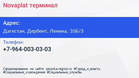 Novaplat, терминал по адресу Дагестан, Дербент, Ленина, 35Б/3 в дальнейшем Организация, размещена в следующих категориях: