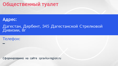 Общественный туалет по адресу Дагестан, Дербент, 345 Дагестанской Стрелковой Дивизии, 8г в дальнейшем Организация, размещена в следующих категориях: