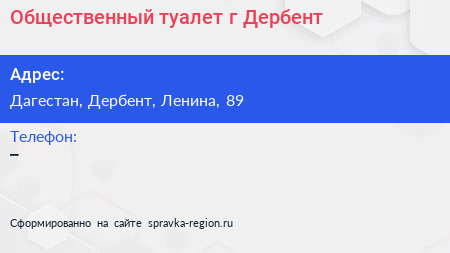 Общественный туалет, г. Дербент по адресу Дагестан, Дербент, Ленина, 89 в дальнейшем Организация, размещена в следующих категориях: