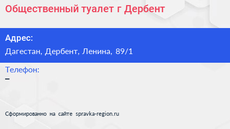 Общественный туалет, г. Дербент по адресу Дагестан, Дербент, Ленина, 89/1 в дальнейшем Организация, размещена в следующих категориях: