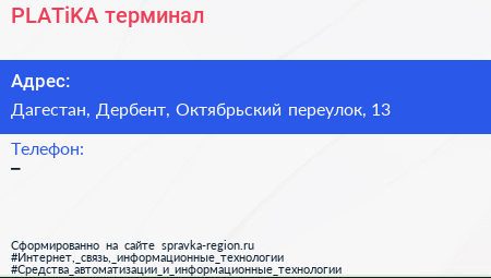 PLATiKA, терминал по адресу Дагестан, Дербент, Октябрьский переулок, 13 в дальнейшем Организация, размещена в следующих категориях: