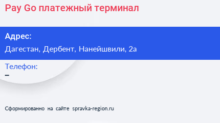 Pay-Go, платежный терминал по адресу Дагестан, Дербент, Нанейшвили, 2а в дальнейшем Организация, размещена в следующих категориях:
