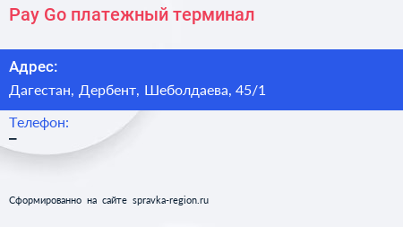 Pay-Go, платежный терминал по адресу Дагестан, Дербент, Шеболдаева, 45/1 в дальнейшем Организация, размещена в следующих категориях: