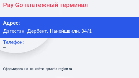 Pay-Go, платежный терминал по адресу Дагестан, Дербент, Нанейшвили, 34/1 в дальнейшем Организация, размещена в следующих категориях: