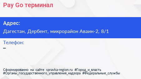 Pay-Go, терминал по адресу Дагестан, Дербент, микрорайон Аваин-2, 8/1 в дальнейшем Организация, размещена в следующих категориях: