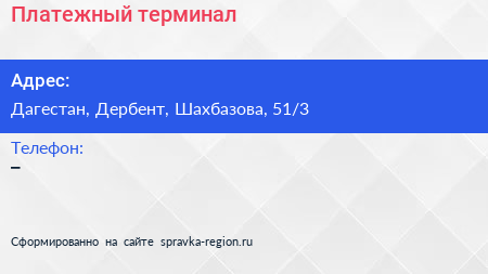 Платежный терминал по адресу Дагестан, Дербент, Шахбазова, 51/3 в дальнейшем Организация, размещена в следующих категориях: