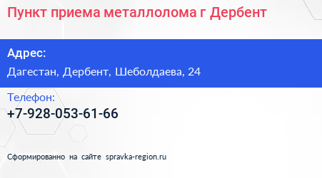 Пункт приема металлолома, г. Дербент по адресу Дагестан, Дербент, Шеболдаева, 24 в дальнейшем Организация, размещена в следующих категориях: