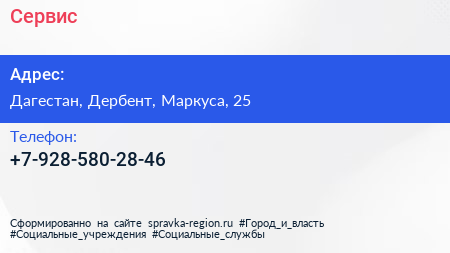 Сервис по адресу Дагестан, Дербент, Маркуса, 25 в дальнейшем Организация, размещена в следующих категориях: