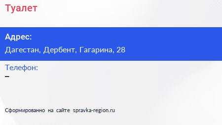 Туалет по адресу Дагестан, Дербент, Гагарина, 28 в дальнейшем Организация, размещена в следующих категориях: