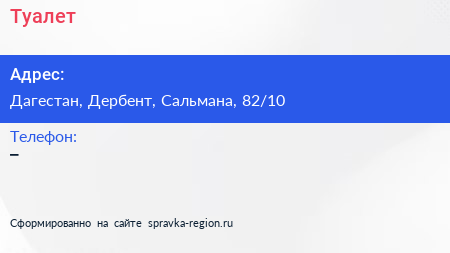 Туалет по адресу Дагестан, Дербент, Сальмана, 82/10 в дальнейшем Организация, размещена в следующих категориях: