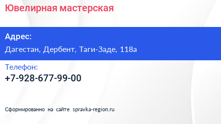 Ювелирная мастерская по адресу Дагестан, Дербент, Таги-Заде, 118а в дальнейшем Организация, размещена в следующих категориях: