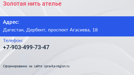 Золотая нить, ателье по адресу Дагестан, Дербент, проспект Агасиева, 18 в дальнейшем Организация, размещена в следующих категориях: