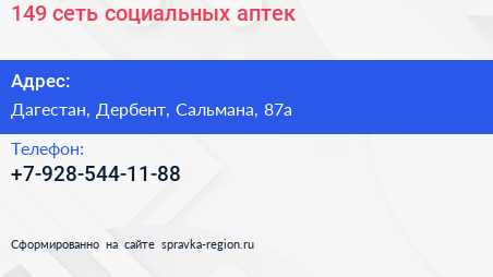 149, сеть социальных аптек по адресу Дагестан, Дербент, Сальмана, 87а в дальнейшем Организация, размещена в следующих категориях:
