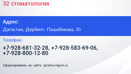 32, стоматология по адресу Дагестан, Дербент, Пашабекова, 35 в дальнейшем Организация, размещена в следующих категориях: