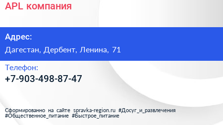 APL, компания по адресу Дагестан, Дербент, Ленина, 71 в дальнейшем Организация, размещена в следующих категориях: