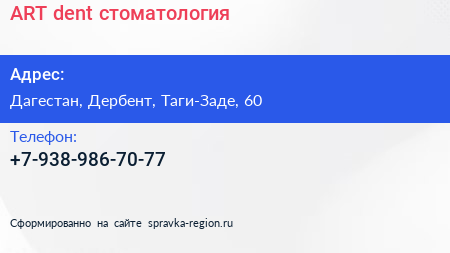 ART dent, стоматология по адресу Дагестан, Дербент, Таги-Заде, 60 в дальнейшем Организация, размещена в следующих категориях: