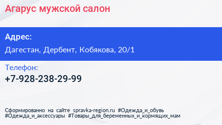 Агарус, мужской салон по адресу Дагестан, Дербент, Кобякова, 20/1 в дальнейшем Организация, размещена в следующих категориях: