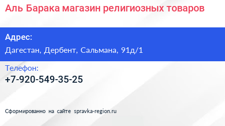 Аль Барака, магазин религиозных товаров по адресу Дагестан, Дербент, Сальмана, 91д/1 в дальнейшем Организация, размещена в следующих категориях: