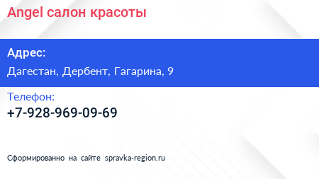 Angel, салон красоты по адресу Дагестан, Дербент, Гагарина, 9 в дальнейшем Организация, размещена в следующих категориях: