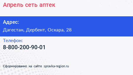 Апрель, сеть аптек по адресу Дагестан, Дербент, Оскара, 28 в дальнейшем Организация, размещена в следующих категориях: