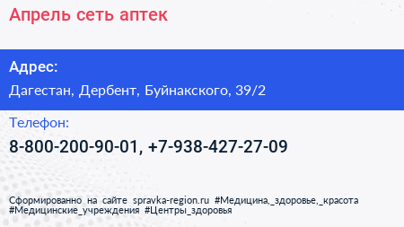 Апрель, сеть аптек по адресу Дагестан, Дербент, Буйнакского, 39/2 в дальнейшем Организация, размещена в следующих категориях: