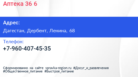 Аптека 36.6+ по адресу Дагестан, Дербент, Ленина, 68 в дальнейшем Организация, размещена в следующих категориях: