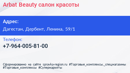 Arbat Beauty, салон красоты по адресу Дагестан, Дербент, Ленина, 59/1 в дальнейшем Организация, размещена в следующих категориях: