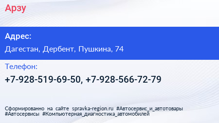 Арзу по адресу Дагестан, Дербент, Пушкина, 74 в дальнейшем Организация, размещена в следующих категориях: