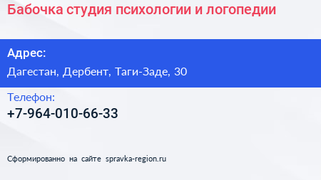 Бабочка, студия психологии и логопедии по адресу Дагестан, Дербент, Таги-Заде, 30 в дальнейшем Организация, размещена в следующих категориях: