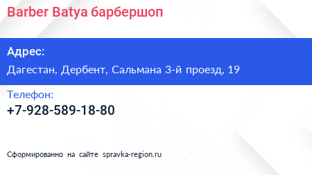 Barber Batya, барбершоп по адресу Дагестан, Дербент, Сальмана 3-й проезд, 19 в дальнейшем Организация, размещена в следующих категориях: