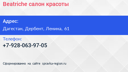 Beatriche, салон красоты по адресу Дагестан, Дербент, Ленина, 61 в дальнейшем Организация, размещена в следующих категориях: